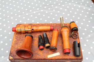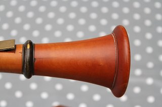 A very good condition early boxwood C clarinet, which is a commission sale for Clarinets Direct. I am extremely grateful to Thomas Carroll, a period clarinet player visiting from the USA, for his assistance with the description below. This clarinet has been much worked over the the last 2 centuries. It is likely that it was of fine German manufacture, probably made around 1810. Originally it would have played about A=435, but subsequently it was shortened, rather crudely, at the top of the upper joint; the file marks can be seen. This was probably an attempt to bring it up to A=440 Hz pitch or even higher. It now plays at approximately that pitch, with a modern Eb clarinet m'piece which sits, however, 2 mm out of the top tenon of the original barrel. The makers stamp is so worn as to be almost indecipherable, but possibly a "Hapsburg" Eagle can be made out in very strong light. There are in total three surface cracks: One to the top of the top joint, above the speaker key, see photos 5 & 11. One to the barrel, see photo 4, and the last to the bell, see photo 10. There are 5 brass keys, and the clarinet is made of boxwood and animal horn. It appears to be in the style of a Grenser instrument. The m'piece, which I believe to be original, is included, but it is so worn as to be unplayable. As mentioned above a Bundy No. 3 Eb m'piece is also included which plays well. The supplied case is worn but functional. |