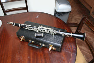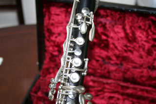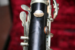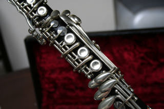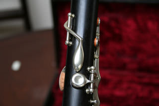 A unique and rare plateau full Boehm Bb clarinet. This one has all the extras: :fork Eb/Bb, articulated C#'G#, LH Ab/Eb key and low Eb. There is no makers stamp, though given the quality of workmanship and style of key work, I think this may be of German manufacture. It is certainly pre-WWII. There are no cracks or damage to the wood. But the original thumb rest has been replaced with a more modern design, and the moved higher, the old position holes have been filled see photo 8. The maillechort keywork is in very good condition. This is a commission sale for Clarinets Direct, the current owner tells me that he recently had the instrument completely overhauled by Hanson in tan leather pads. In addition he preferred to play this clarinet with a Buffet barrel, supplied, and a Vandoren 5RV, also supplied, in excellent condition. The case is also in very good shape. The instrument tunes well at A=440 & would suit a sax/flute doubler. |