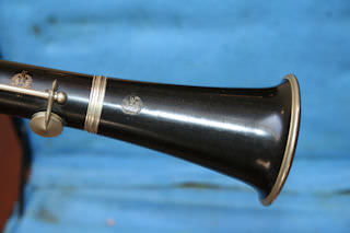 A rare professional Selmer Paris Centered Tone full Boehm clarinet. This clarinet is in very good condition for its age with good German silver key work with no wear. The wood overall is good, however there are a couple of cracks: a surface crack to the upper joint, see photo 6, through the top trill key hole which does not go through to the bore, and has no effect on the response. It has been pinned in the past. And another running down from the top tenon down to the top of the throat A hole, again, this does not go through to the bore. The pads are all sealing well, and all touch & tenon corks are good. The wood shows surface scuffs and marks but all pieces are original Selmer. The case is a double, well used, but functional, and the m'piece a Selmer "HS*". |