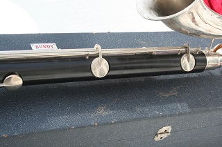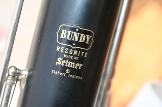 This is a very good condition Selmer Bundy Contra-Alto Clarinet in Resonite to low Eb, which is a commission sale for Clarinets Direct. There are no cracks or damage to the body; minor surface scratches and marks only. The crook and the bell have only a few light scratches, with no dents or repairs. Though the Nickel Silver plating shows some "cloudiness" there is only slight wear to some of the ring finger touchpieces the plating is around 95%. The instrument plays well, and the pads which are tan leather are all sealing. The key work is well regulated and the serial nos. are 298. The used case protects the instrument well, and the interior shows some tears to the lining. The exterior had originally 3 latches, of which 1 has failed, the remaining 2 latch securely. The m'piece is a used Selmer Bundy 3 in good condition. There is also a Vandoren No. 2 reed.  |