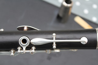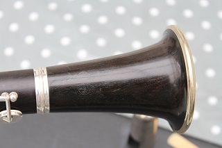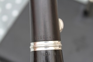 A good condition Buffet E13 clarinet in Silver plate. The E13 is the top selling student wooden clarinet worldwide. The matching serial numbers are K150143, and all pieces are original with Buffet stamps. There is no damage to the wood, which is crack and repair free. The Silver plating shows no wear, it is in fine shape throughout. The instrument has just had a complete re-pad in Pisoni deluxe fish skin pads, and is sold with our full 1 year warranty. The case is the original which is in good condition. The m'piece is an up-grade to a used professional model Vandoren 5RV, which substantially improves the response and tuning. The wood for current E13s is being treated by Buffet with a chemical compound, which is supposed to inhibit cracking. In fact this seems to be causing some joint problems for Buffet, with many new instrument owners reporting problems with sticking joints to dealers, due to this compound leaching out from the wood end grain. At the period this instrument was made, thankfully the Grenadilla wood was left to age naturally prior to manufacture. |