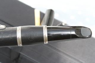 This is a nice condition Professional model Artist Noblet Paris Eb Piccolo Clarinet in Grenadilla wood. This is not to be confused with the cheaper Model 40 Noblet Eb clarinet, which is a student instrument. The wood condition overall is good but there are minor scuffs and marks, [ the worst of which is around the top trill key, see photos 5 & 6] there are NO cracks or repairs. The instrument has excellent condition finest Pisoni white leather pads throughout. There is no joint wobble and the regulation is in fine order. The instrument has serial number 18139. The German silver key work shows a patina consistent with its' age, and what little plating wear there is, is mainly to the pillars. The supplied m'piece tunes the instrument exceptionally well, and the case is a modern replacement in good condition. |