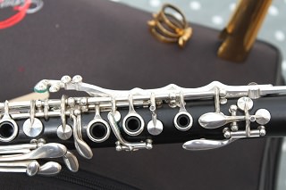 An excellent condition Buffet RC Full Boehm, in Silver plate. This instrument features; fork Eb/Bb, LH Ab/Eb, articulated C#/G# & to low Eb. Therefore superior to current Prestige specification. This clarinet could be purchased as an alternative to buying a pair, as A clarinet parts can be successfully negotiated with the extra mechanism and the ability to transpose. There is no damage to the wood, which is pristine. The Silver plate key work is excellent throughout, with only one patch of wear to the inside of the E/B LH key, see photo 7. Indeed the excellent quality if this Silver plate contrasts sharply with that found on more modern Buffet clarinets. The instrument has recently been overhauled in leather pads and all are in excellent condition. The matching serial nos. are F249429 which dates to 1984. At this time the RC was Buffet's most expensive clarinet, and this particular model was the most expensive key work option of the Bb range. Thus this clarinet was amongst the finest instruments Buffet then made; a special order clarinet. The barrel is an upgrade to a Chadash Buffet, which is of the right quality for this instrument and tunes it well with the supplied "as new" stock Buffet m'piece. The case is a modern "Clarinet" with many pouches and shoulder carry straps, it is in excellent condition. |